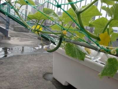 週末が明けて月曜の朝、キュウリが少しずつ大きくなってきています。