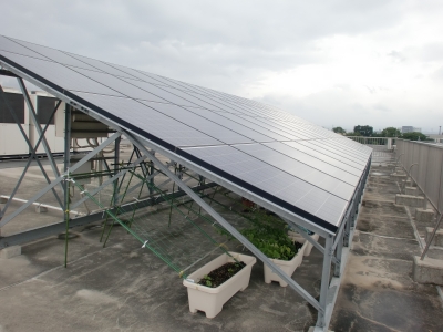 風雨がまだ弱いうちに太陽光発電パネルの下にもぐらせてあげました。