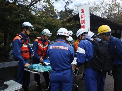 会場では、有線給電式ドローンを使った災害時の安否確認のデモを