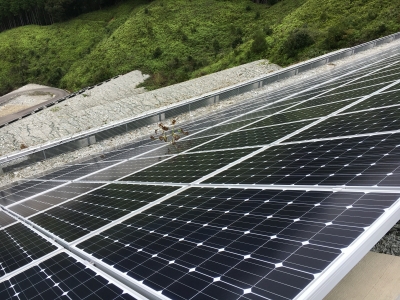フカデンエナジー尾鷲の太陽光発電所は、傾斜30度の急斜面に